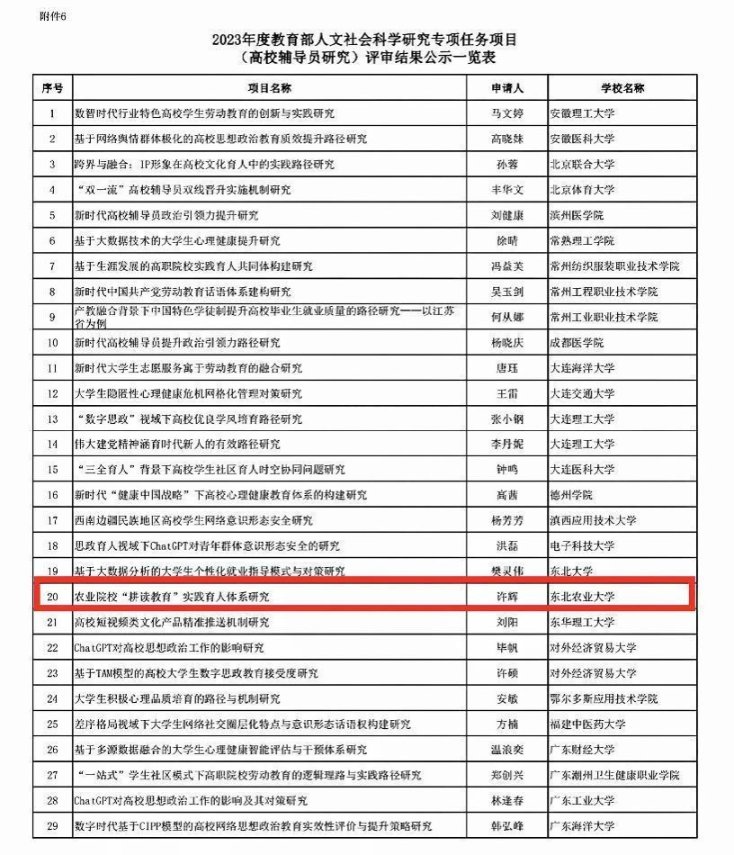 9月18日,教育部社科司公示2023年度教育部人文社会太阳集团一般项目拟立项名单,我院党委副书记许辉申报的《农业院校“耕读教育”实践育人体系的探索和研究》获批2023年教育部人文社会太阳集团专项任务项目(高校辅导员研究)立项,为我校第二次获此项目立项。