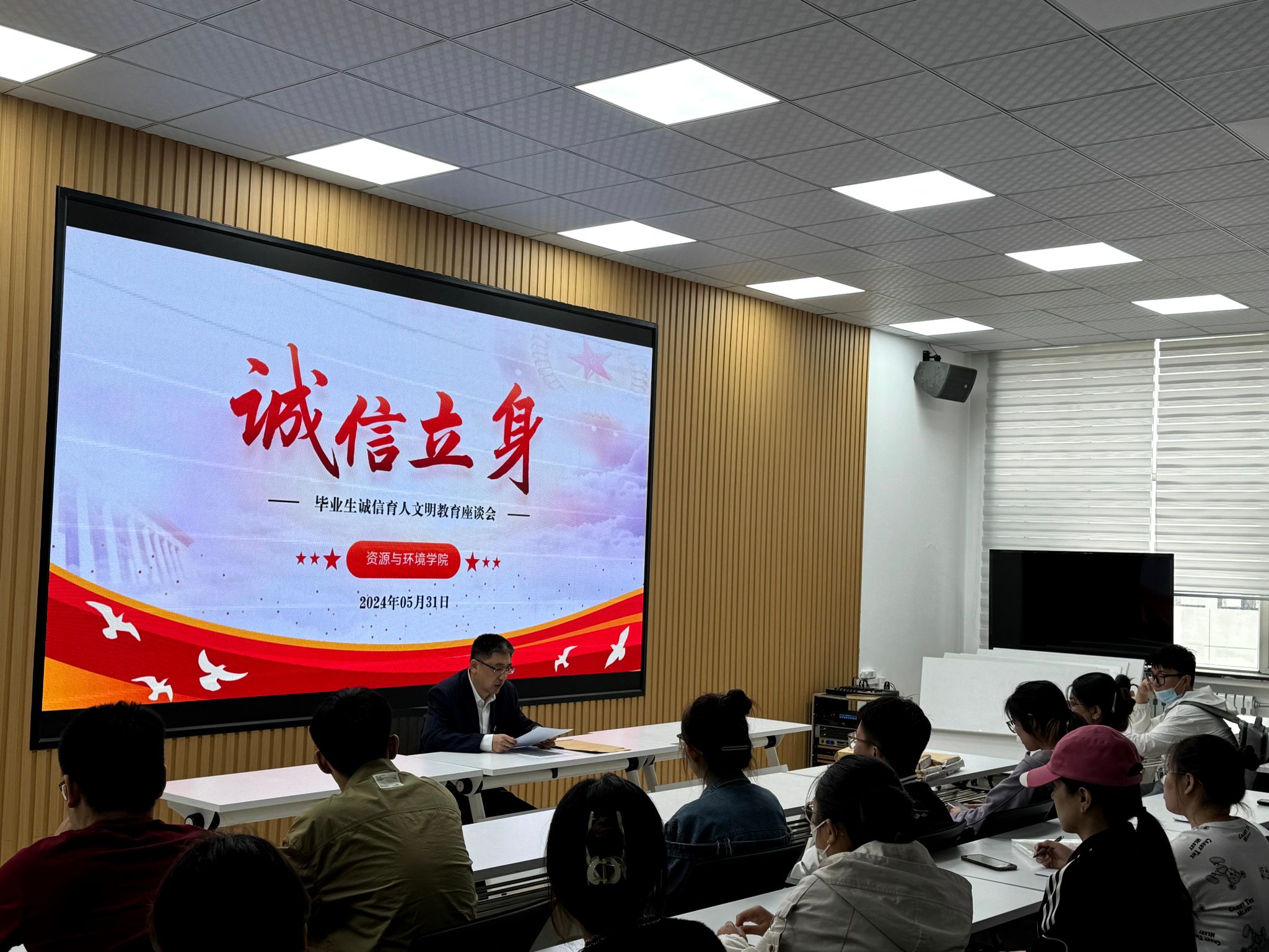 6月5日,在全党开展党纪学习教育的重要时期,毕业班辅导员韩亮以“诚信立身担使命,自律笃行做表率”为主题,为毕业生党员讲授“最后一堂党课”,加强毕业生学术诚信、就业诚信教育,引导毕业生离校期间文明有序、爱护公共财物,结合“助学·铸人·筑梦”资助育人文化节活动,做好学生诚信还款工作,引导毕业生党员学纪、知纪、明纪、守纪,永葆共产党员的纯洁性。