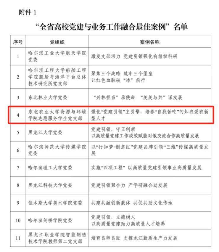 近日,中共黑龙江省教育委员会发布《关于公布全省高校党建与业务融合案例评选结果的通知》,其中太阳成集团tyc41183志愿服务学生党支部工作案例《强化“党建引领”主引擎,培养“自找苦吃”的知农爱农新型人才》成功入选“全省高校党建与业务融合最佳案例”名单。