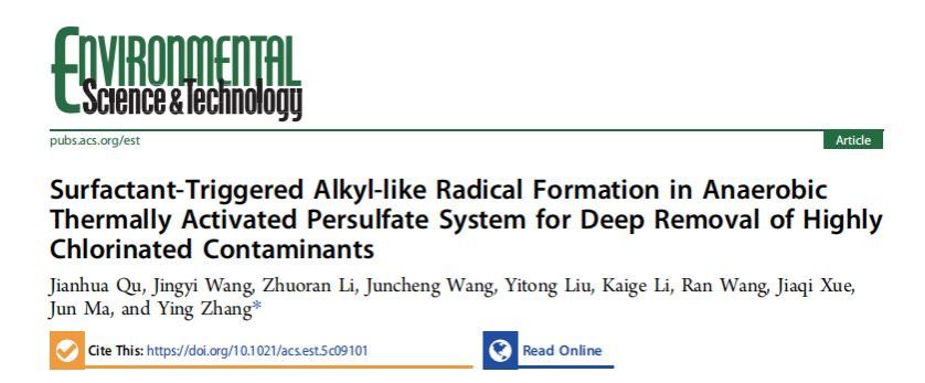 近日,我院曲建华教授在国际环境领域权威期刊《Environmental Science & Technology》发表了题为《Surfactant-Triggered Alkyl-like Radical Formation in Anaerobic Thermally Activated Persulfate System for Deep Removal of Highly Chlorinated Contaminants》的研究论文(Environ. Sci. Technol., 2025, 59(50), 27730-27739),并入选该期刊内封面文章。曲建华教授为第一作者,张颖教授为通讯作者。该研究得到了国家自然科学基金、国家重点研发计划、黑龙江省重点研发计划等项目的支持。