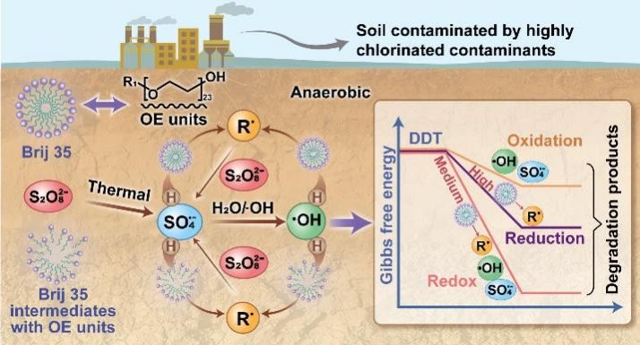 本研究聚焦传统氧化过程中高氯代污染物(HCCs)难以被深度去除的关键科学问题,首次揭示了在厌氧热活化过硫酸盐(PS)体系中,含烷基氧乙烯(OE)单元的表面活性剂可诱导生成还原性类烷基自由基(R•),从而实现对HCCs的深度去除。研究发现,Brij 35等含OE单元的表面活性剂可通过其OE单元中的α-H与SO4•-/HO•发生氢提取反应,生成具有强还原性的R•,且R•的生成量与OE单元数量呈显著正相关。通过调控Brij 35浓度,构建了“先还原后氧化”的氧化还原协同体系,使DDT降解率接近完全,矿化率达65.83%,分别是单独氧化体系和还原主导体系的9.46倍和1.40倍。该体系适应复杂环境条件,且对多种卤代有机物均表现出良好的去除效果。本研究为表面活性剂/热/PS体系中还原性自由基的形成机理提供了新的视角,有助于促进HCCs污染场地的可持续环境修复。