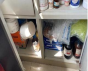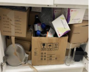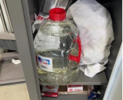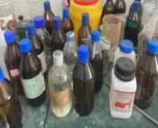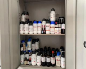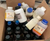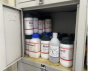 1. 药品与玻璃器皿、鞋盒混合摆放 2. 存在不明液体 |
