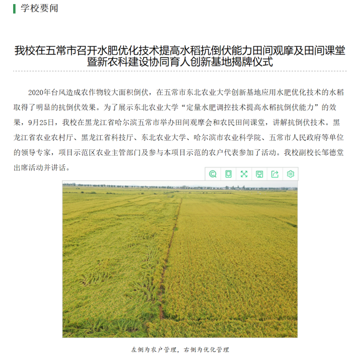 科技小院围绕五常水稻生产上优质稻品种倒伏严重、易早衰、香气退化,影响稻米品质的核心问题,“校院地”三方在哈尔滨市农业科学院以及五常市两个基地同时开展攻关,选派研究生长期驻扎基地,调研走访农户,深入田间地头,了解当地水稻生产的实际问题,通过优化密度、水肥管理和应用化控措施,同时结合叶面喷施氨基酸、镁肥、富硒、富锌等补充中微量元素技术,集成科学施肥、合理密植、科学灌溉和绿色植保技术,构建水稻绿色高产栽培技术规程,为稻花香配套水稻专用套餐肥;同时,为哈粳稻系列品种提供了水肥管理配套方案,基本解决了哈粳稻系列品种倒伏问题。
