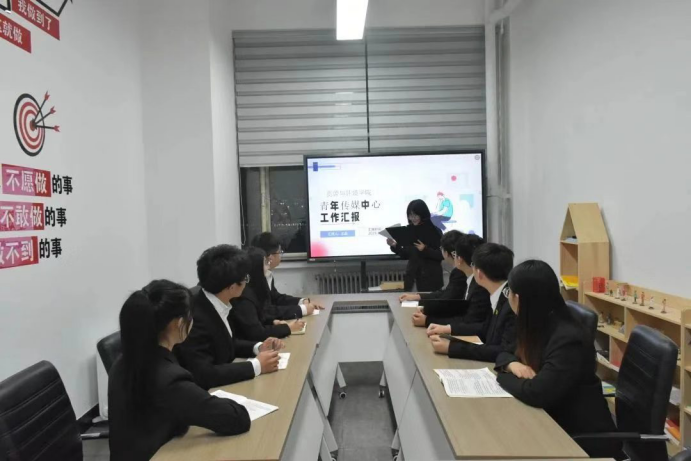 学生团委副书记周欣怡对本学期前期工作进行汇报并对未来工作做出展望。在社会实践、科技创新、评优工作等方面进行讲解阐述。未来学生团委将继续突出我院特色,落实团务工作,发挥思想引领作用。不断学习、与时俱进,在思想上、理论上与时代同向同行。