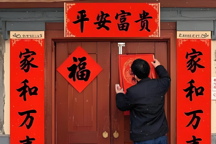 2.纳福贴联类:如手写春联、张贴福字/对联、门楣挂饰布置等承载新春期许的场景,需展现年俗的仪式感。