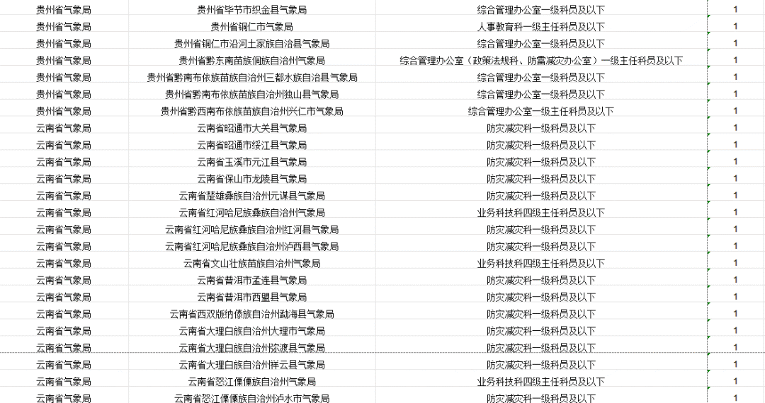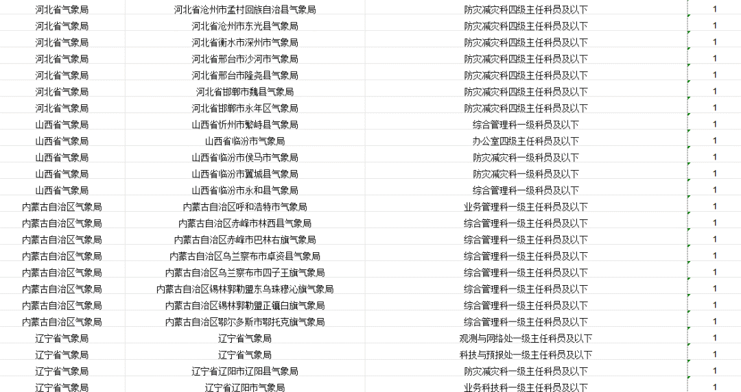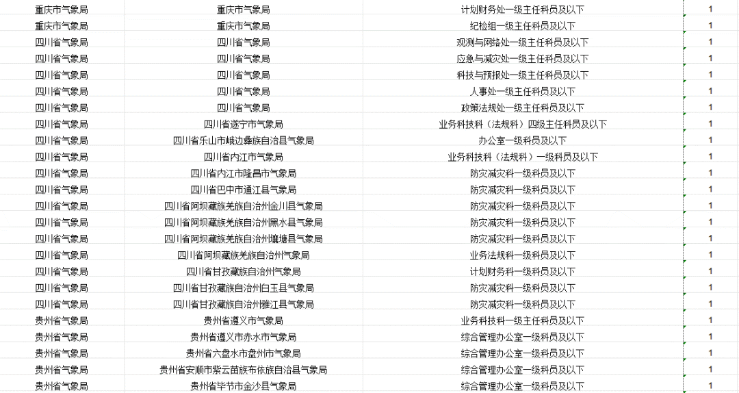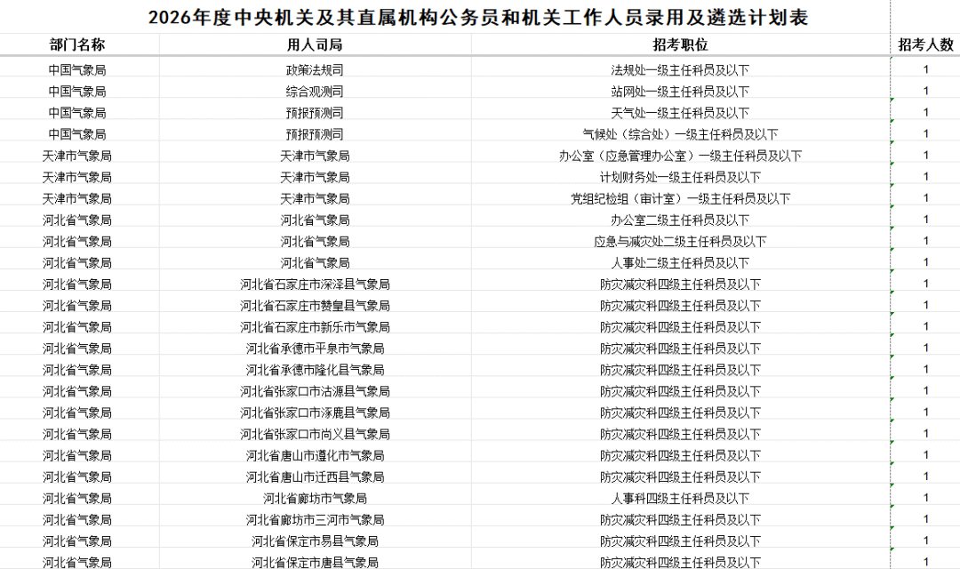 中国气象局及其直属机构计划招录265人。其中,中国气象局机关招录4人,中国气象局系统参照公务员法管理事业单位招录261人。