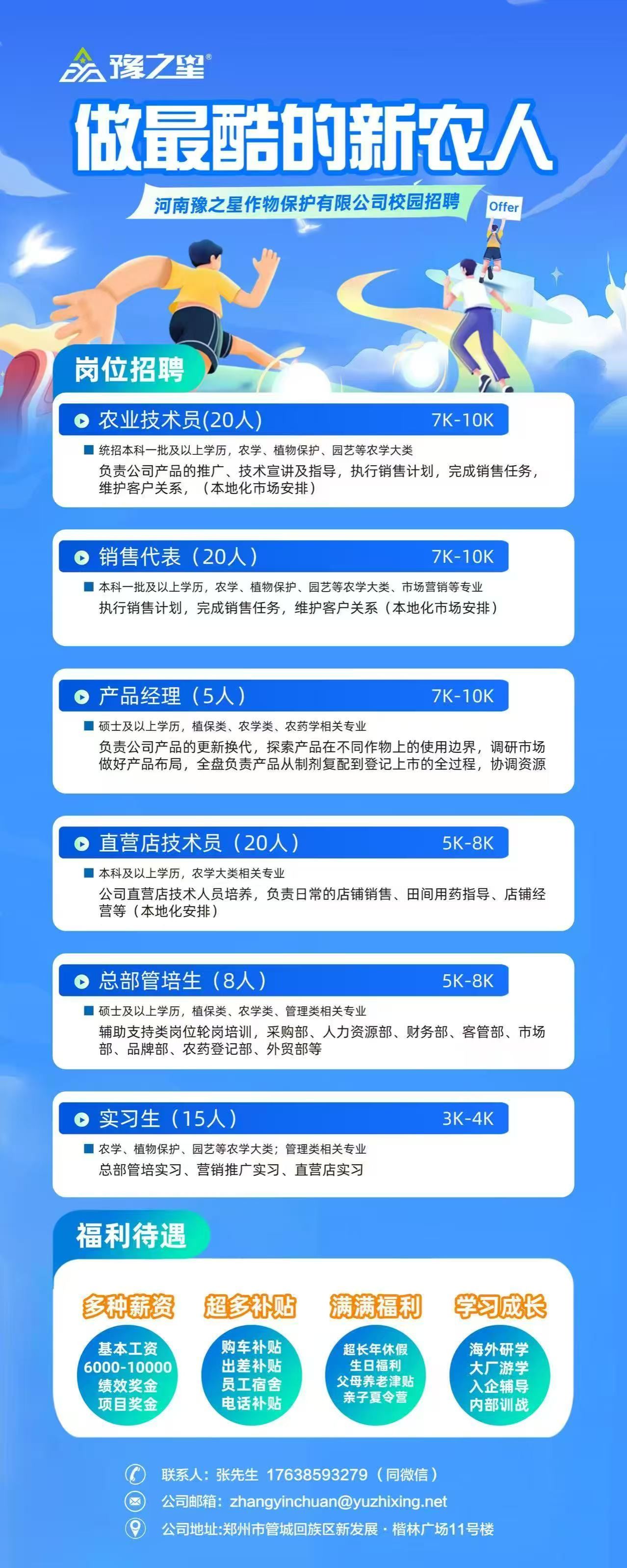 招聘亮点:覆盖农学、植保、园艺等多专业,开放农业技术员、销售代表、产品经理等6类岗位,薪资6K-10K,福利含绩效奖金、各类补贴、超长假期、海外研学等。