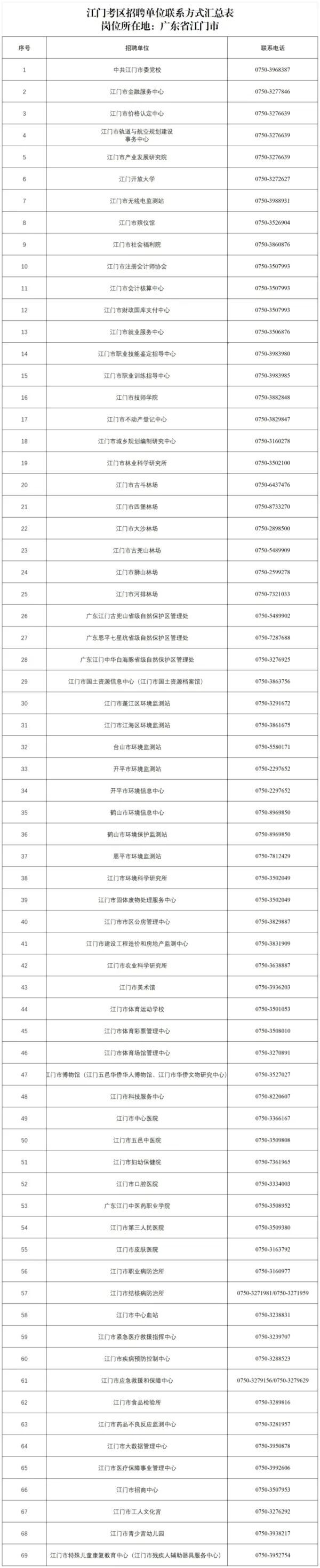 2026年广东省事业单位集中公开招聘高校毕业生公告(https://hrss.gd.gov.cn/zwgk/sydwzp/zpgg/content/post_4848983.html)已于2026年1月27日发布。本次招聘中,江门市383家事业单位统筹推出835个优质岗位,计划招录969名优秀人才。江门正以日新月异的发展态势、开放包容的城市胸怀,热切期盼各位怀揣理想抱负的青年才俊选择侨乡、扎根江门。为更好地帮助报考人员解疑释惑,现公布我市各招聘单位联系方式,如对报考有疑问的,可直接联系招聘单位具体咨询了解。